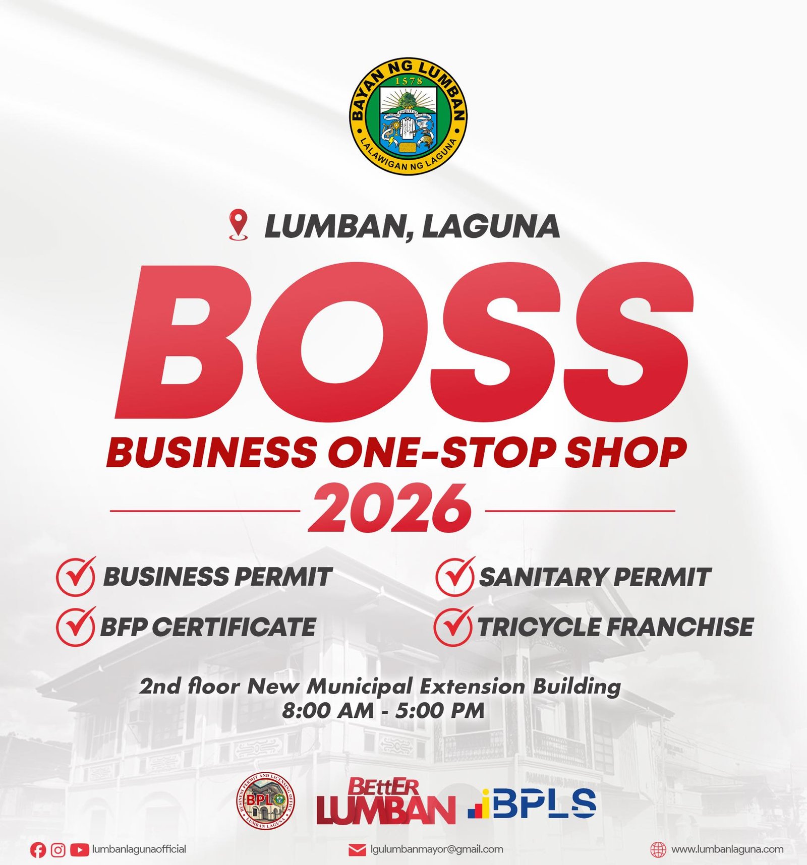 | Inaanyayahan po ng Pamahalaang Bayan ang lahat ng mga negosyante at mamamayan na samantalahin ang pagbubukas ng Business One-Stop Shop (BOSS) para sa pagpaparehistro at pagre-renew ng mga sumusunod:• Business Permit/License• BFP Certificate• Sanitary Permit• Tricycle FranchiseMaaaring magtungo sa 2nd Floor, New Municipal Extension Building, mula ika-8:00 ng umaga hanggang ika-5:00 ng hapon, upang mapabilis at mapadali ang inyong transaksyon.Ang BOSS ay inilaan upang magbig...